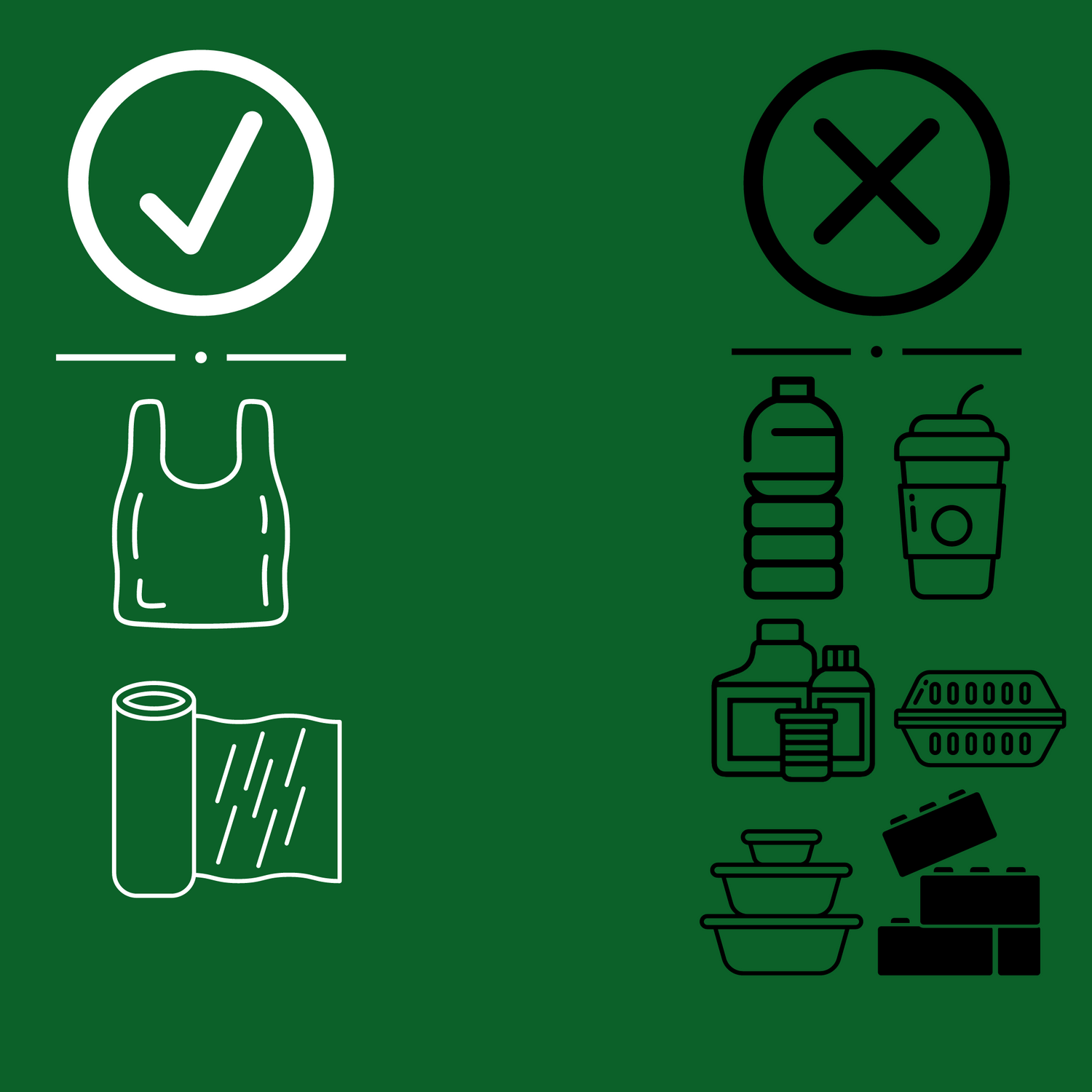 Relative to the above image, materials such as bags or film products are accepted in this program. Bottles, containers, Styrofoam cups, toys, and bowls are examples of plastic products that we do not accept.